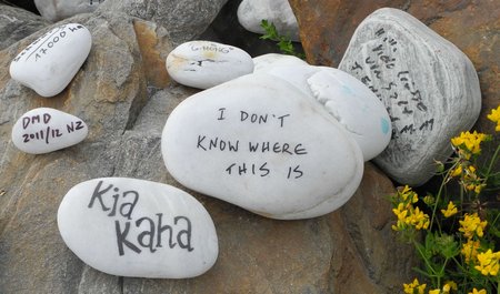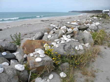 Hier hinterlassen viele eine Botschaft auf weißen Steinen, die man dann einfach am Straßenrand ablegt.