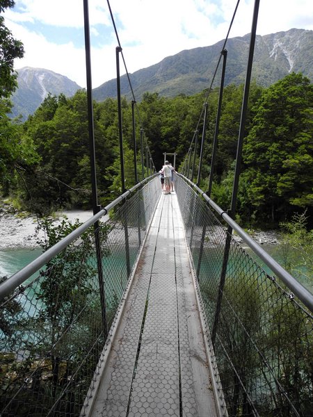 Auf unserem Weg über den Haast Pass lagen die Blue Pools. Vom Parkplatz an der Strasse aus ging es ein Stückchen durch den Wald und dann über eine Hängebrücke.