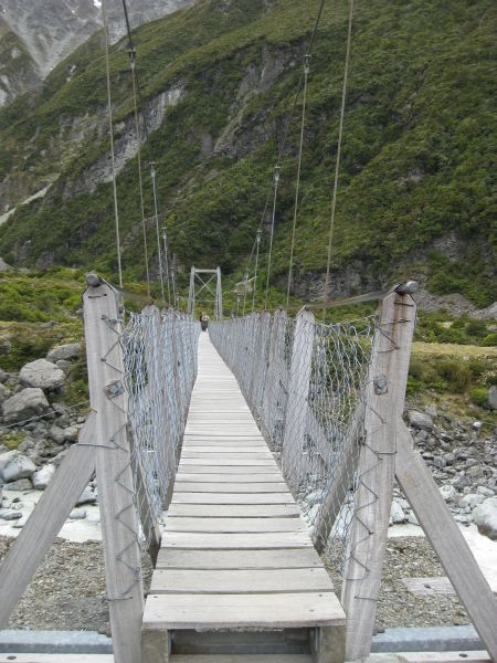 Von dort ging es dann zu Fuß in das Hooker Valley bei strahlendem Sonnenschein, aber auch ziemlichem Wind. Über 2 Hängebrücken ging es in das Tal des Mt. Cook hinein.