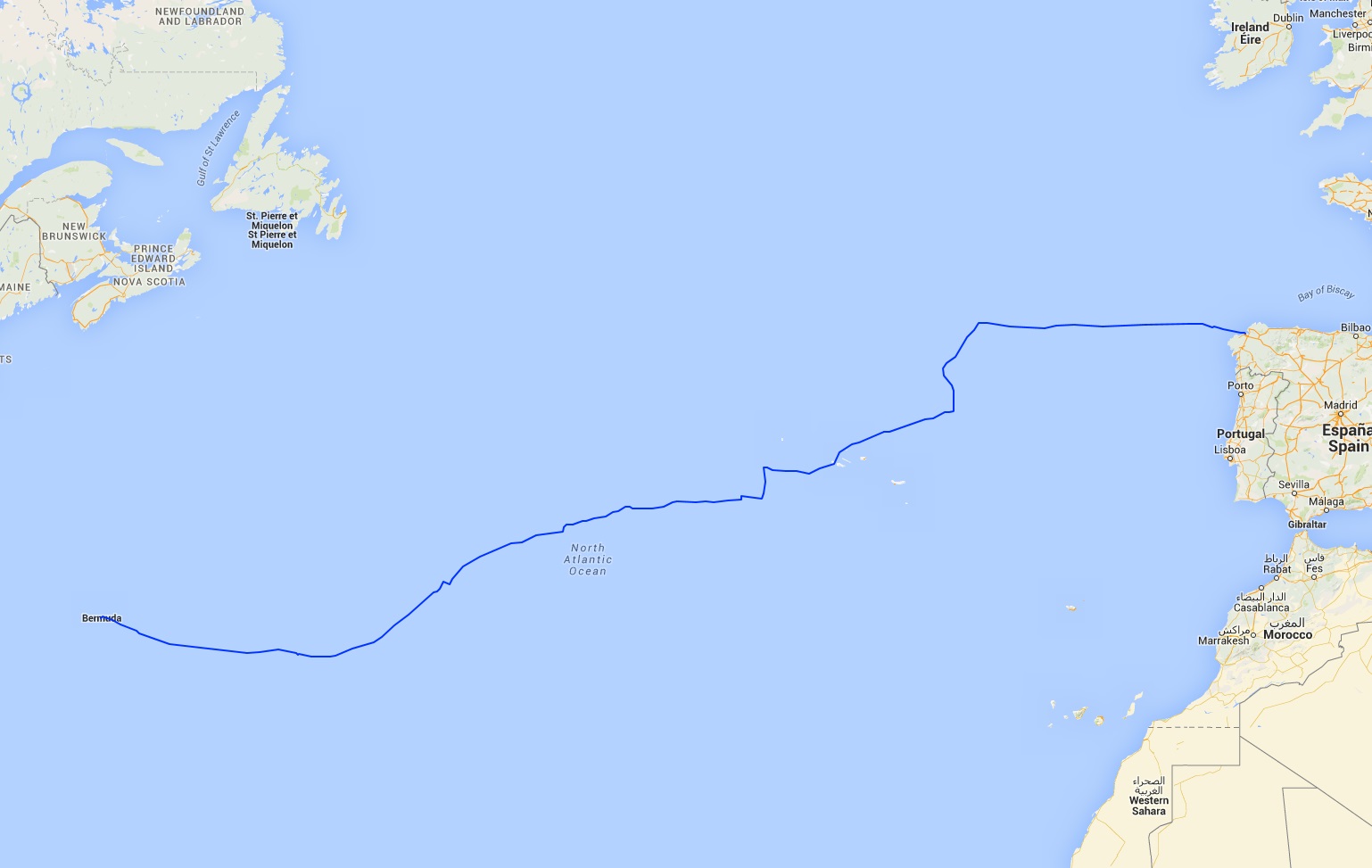 Atlantiktörn: von Bermuda nach A Coruna Von So. 29.06. bis Mo. 21.07. habe ich auf der Segelyacht „High Yield“ (GER 5335), einer Nautor’s Swan 45, den Atlantik überquert – naja 3/4. Ein tolles Erlebnis und etwas mehr als 3.200 Seemeilen. Hier die Fahrtroute: