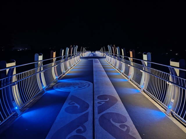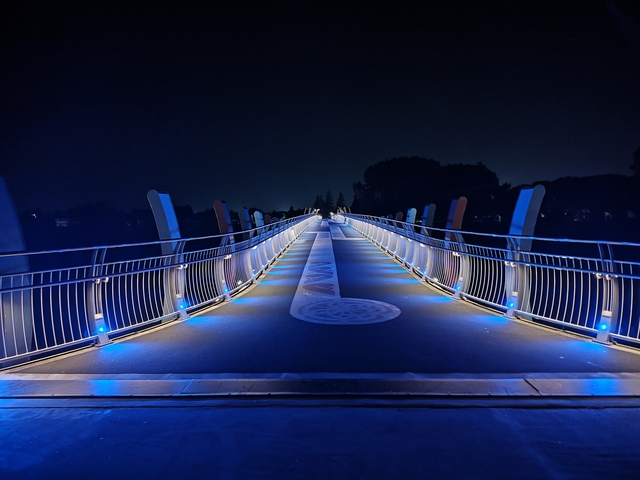 Die abends so schön beleuchtete Brücke am Campingplatz hat auch einen Zähler für Fußgänger und Radfahrer pro Tag und Jahr. (Tja, die PWM.)