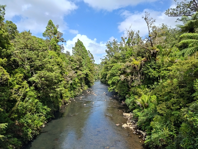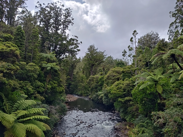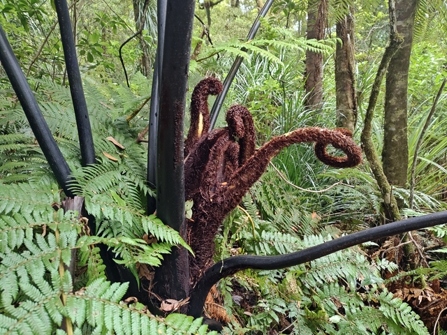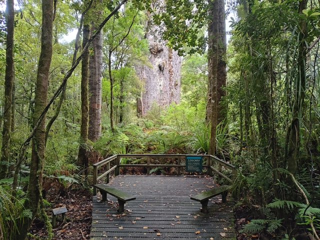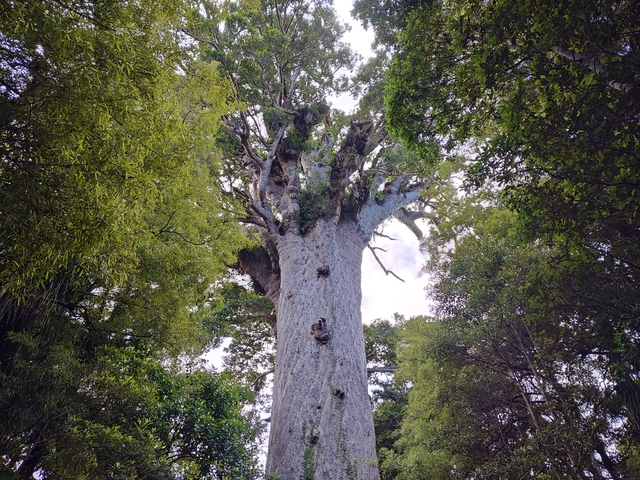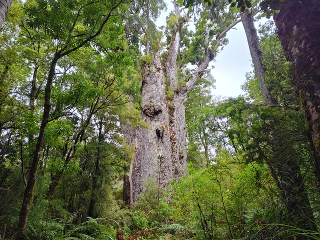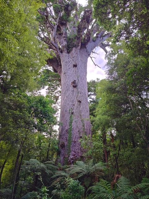 Das ist der größte Baum Neuseelands und angeblich der 5. größte der Südhalbkugel. Der Baum selbst erzeugt ein Ökosystem mit über 100 Tier- und Pflanzenarten. Nicht nur der Wipfel ist riesig; die Wurzeln sollen bis in eine Tiefe von 5 Metern gehen und den Umkreis des Wipfels deutlich überbieten. Und der Kauribaum wächst nicht nur in die Höhe, sondern er dreht sich auch, um sich besser gegen Wind zu wappnen. Das sieht man am Stamm aber erst, wenn der Baum ca. 1000 Jahre alt geworden ist.