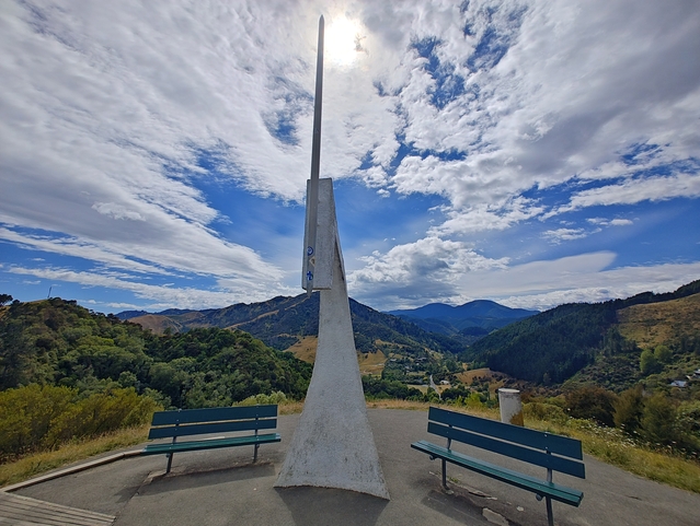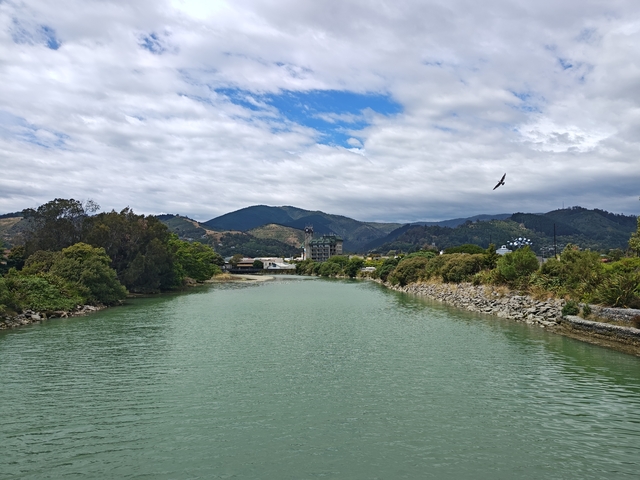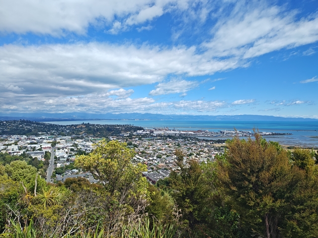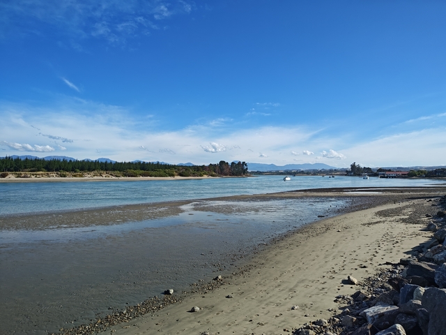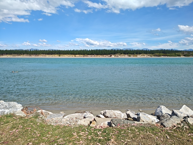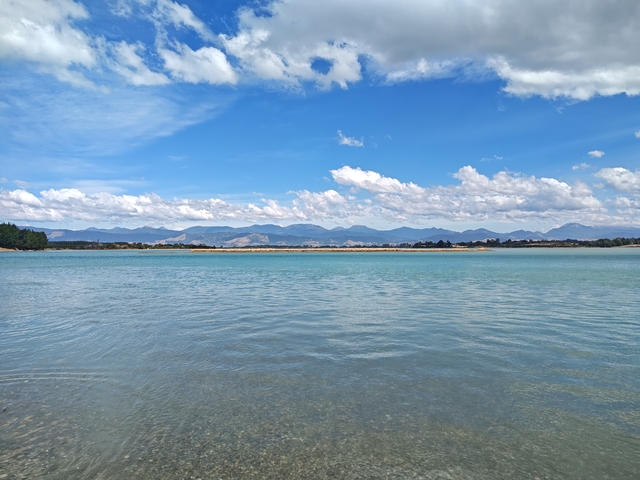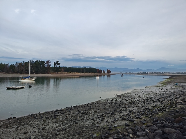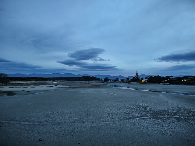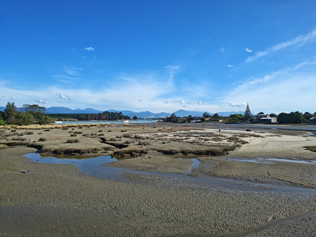 Nelson – Mapua In Nelson wird die Mitte Neuseelands verortet. Mapua: Der Blick aus dem Camper und der Ort zum Schwimmen.